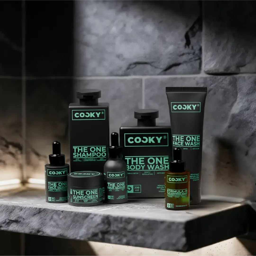 Cocky Pro features all our products: facewash, face serums, sunscreen, and hair care essentials for a complete grooming routine.